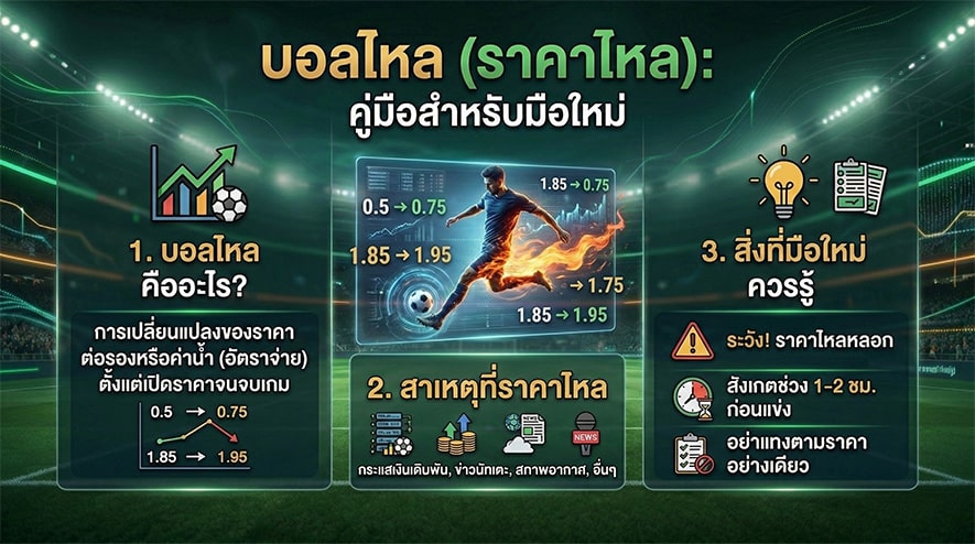 ส่วนคำว่า บอลไหล หมายถึงราคาที่มีการเปลี่ยนแปลงระหว่างการแข่งขันตามสถานการณ์จริงในสนาม เช่น มีการยิงประตู ใบแดง หรือจังหวะเกมเปลี่ยนฝั่ง ราคาจะปรับทันทีเพื่อสะท้อนความเสี่ยงใหม่ การเล่นบอลไหลให้เข้าใจง่ายควรดูรูปเกมเป็นหลัก สังเกตทีมที่ครองบอล โอกาสยิง และทิศทางราคาว่าขยับขึ้นหรือลง ไม่ควรไล่แทงตามอารมณ์หรือความตื่นเต้น